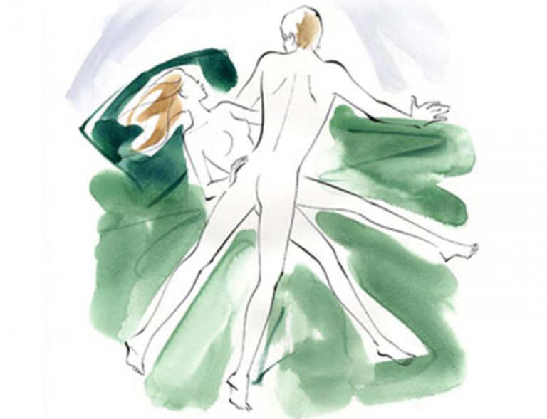 Nàng đứng đối diện mặt chàng, lấy một chân làm trụ, giơ chân kia vòng qua hông chàng. Còn chàng thì một tay ôm nàng, tay còn lại đỡ chân của nàng để tạo thành tư thế vũ công Ballet vững vàng rồi từ từ thâm nhập dương vật vào âm đạo của nàng. Ở tư thế này cả hai quan hệ như đang cùng nhau nhảy múa. Việc ôm chặt nhau sẽ cảm nhận độ nóng của cơ thể rõ rệt hơn. Đồng thời cả hai có thể dành cho nhau một nụ hôn kiểu Pháp ngọt ngào, sâu lắng.