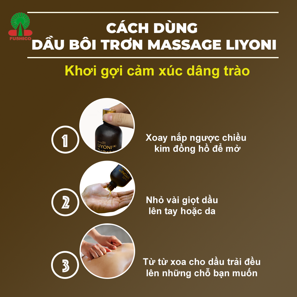 Cách sử dụng: Dầu Bôi Trơn LIYONI(+), Massage và Bôi trơn. Cho một lượng dầu vừa đủ vào lòng bàn tay, xoa đều lên cơ thể. Sau đó kết hợp kỹ thuật massage đến các vị trí ưa thích như: VÙNG CỔ - VÙNG BỤNG – VÙNG NHẠY CẢM từ 30-40 phút hoặc hơn nữa để có Cảm Xúc Khơi Gợi Dâng Trào!. (có thể tắm lại bằng nước hoặc không tùy thích).