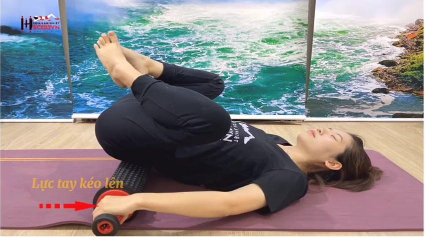 Thực hiện động tác: Dùng lực chi dưới uốn cong lưng lên để mở góc khe gian đốt sống. Kéo con lăn lên, xuống. Thực hiện thao tác 4 lần, mỗi lần 30 giây, giữa mỗi lần nghỉ 10 giây.