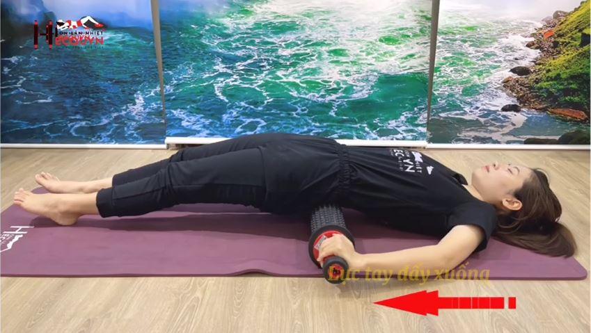 Thực hiện động tác: Dùng lực 2 tay đẩy con lăn xuống dưới. Thực hiện thao tác 4 lần, mỗi lần 30 giây, giữa mỗi lần nghỉ 10 giây.