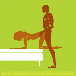 Nàng quỳ bằng cả chân và tay theo tư thế con hổ, đầu gối sát mép giường. Chàng đứng dưới đất, hai chân mở rộng bằng vai và xâm nhập từ đằng sau.
