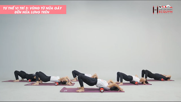 Tư thế chuẩn bị: Nằm ngửa, nhìn thẳng, con lăn đặt ở phía dưới lưng, 2 tay chống ngược ra sau, 2 chân nâng lên và dùng lực nhấc hông.